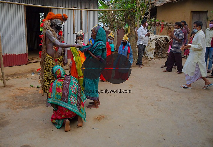AGARTALA,TRIPURA,INDIA,12-04-2020 : Folk artists are performing the rituals of Shiber Gajan with covering the face with cloth and mask , during a government-imposed nationwide lockdown as a preventive measure against the COVID-19, in the outskirts of Agartala, capital of the Northeastern state of Tripura, India. PHOTO BY-ABHISEK SAHA