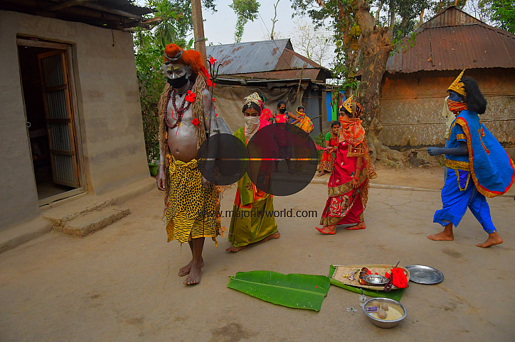 AGARTALA,TRIPURA,INDIA,12-04-2020 : Folk artists are performing the rituals of Shiber Gajan with covering the face with cloth and mask , during a government-imposed nationwide lockdown as a preventive measure against the COVID-19, in the outskirts of Agartala, capital of the Northeastern state of Tripura, India. PHOTO BY-ABHISEK SAHA