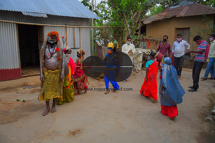 AGARTALA,TRIPURA,INDIA,12-04-2020 : Folk artists are performing the rituals of Shiber Gajan with covering the face with cloth and mask , during a government-imposed nationwide lockdown as a preventive measure against the COVID-19, in the outskirts of Agartala, capital of the Northeastern state of Tripura, India. PHOTO BY-ABHISEK SAHA