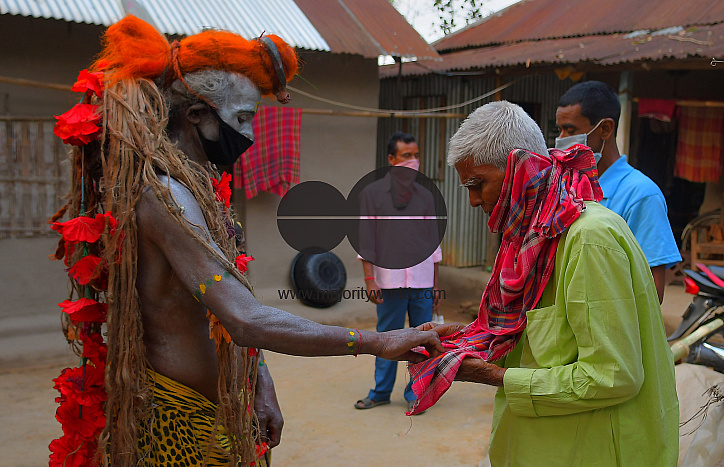 AGARTALA,TRIPURA,INDIA,12-04-2020 : Folk artists are performing the rituals of Shiber Gajan with covering the face with cloth and mask , during a government-imposed nationwide lockdown as a preventive measure against the COVID-19, in the outskirts of Agartala, capital of the Northeastern state of Tripura, India. PHOTO BY-ABHISEK SAHA