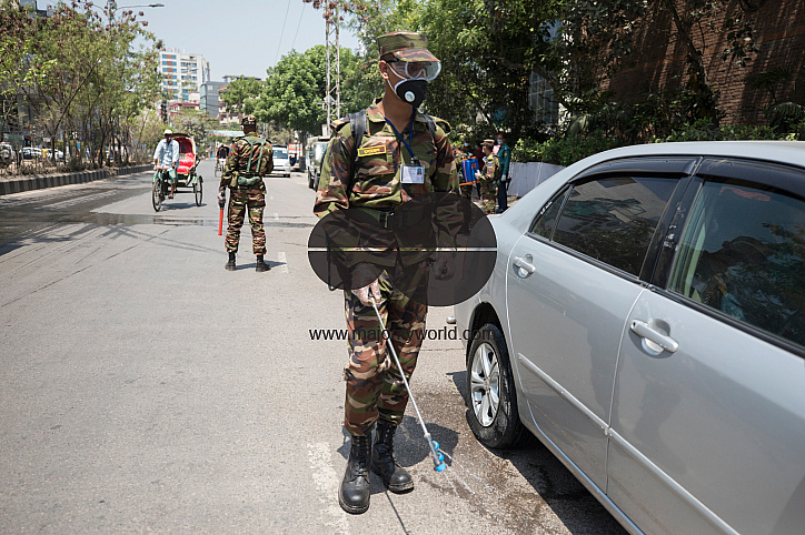 Bangladesh Army personals spray disinfectant on cars during the nationwide lockdown by the authority amid concerns of corona virus pandemic in Dhaka, Bangladesh on April 01, 2020. Bangladesh has confirmed 54 cases, with 6 deaths due to corona virus (COVID-19), According to IEDCR officials. Photo by Salahuddin Ahmed/Sipa USA
