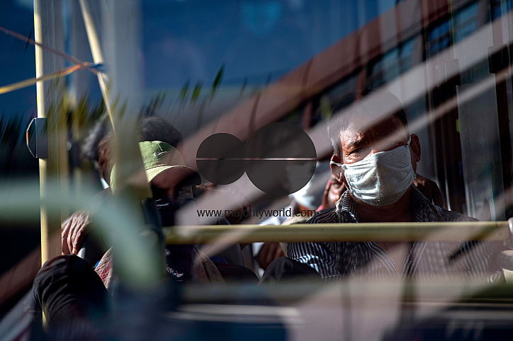Indian migrant laborers and homeless people sit inside a bus after being evicted from the banks of Yamuna River where they have been squatting during lockdown in New Delhi, India, Wednesday, April 15, 2020. Photographer: Kuldeep Singh Rohilla