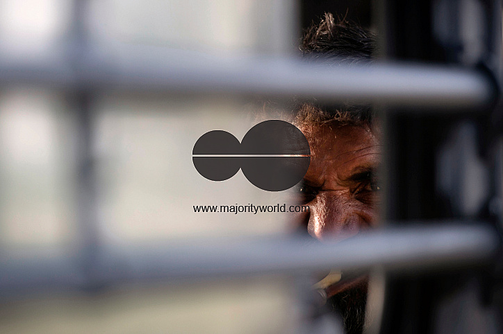 An Indian homeless man sits in a bus as he is being evicted with other homeless people and migrant laborers from the banks of Yamuna River where they have been squatting during lockdown in New Delhi, India, Wednesday, April 15, 2020. Photographer: Kuldeep Singh Rohilla