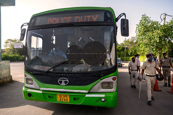 An Indian police officers checking and escorting the bus full of migrant laborers and homeless people after evicting them from the banks of Yamuna River where they have been squatting during lockdown in New Delhi, India, Wednesday, April 15, 2020. Photographer: Kuldeep Singh Rohilla