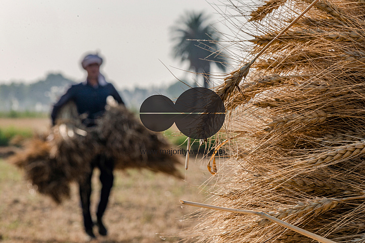 Farmers carry bundles of cut wheat while harvesting a field in the Bulandshahr district of Uttar Pradesh, India, on Tuesday, April 21, 2020. The farm sector is likely to be the lone bright spot for India's stalled economy as Prime Minister Narendra Modi crafts a plan to exit the worldâs biggest lockdown and revive stalled economic activity. Photographer: Kuldeep Singh Rohilla