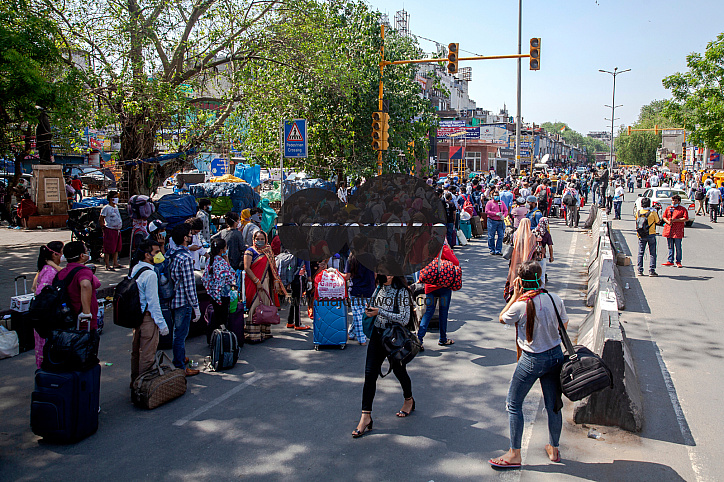 Indians wearing protective masks stand with their luggage in queue outside a railway station as they wait to board trains that will take them to their native places after Indian railways, announced to restart limited operations, as India remains under an