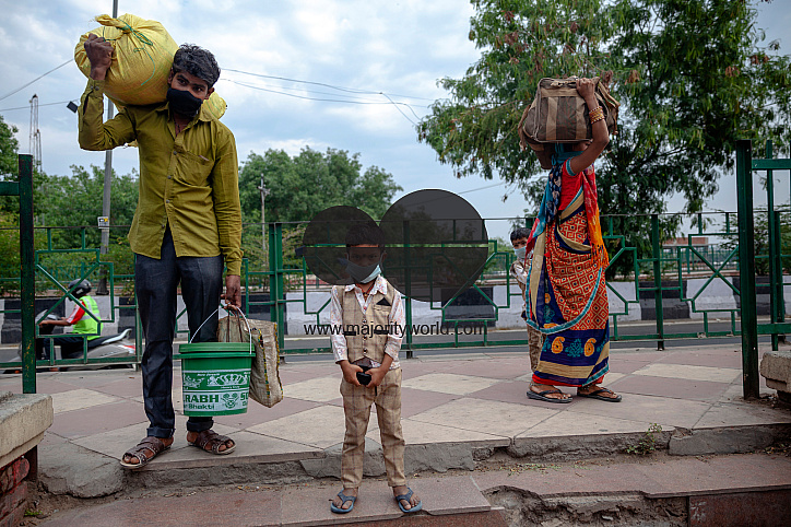 An Indian migrant labourer and his family carry their luggage outside a railway station as they wait to board a train that will take them to their native place after Indian railways, announced to restart limited operations, as India remains under an unprecedented extended lockdown over the highly contagious coronavirus (COVID-19) on May 12, 2020 in New Delhi, India. Photographer: Kuldeep Singh Rohilla