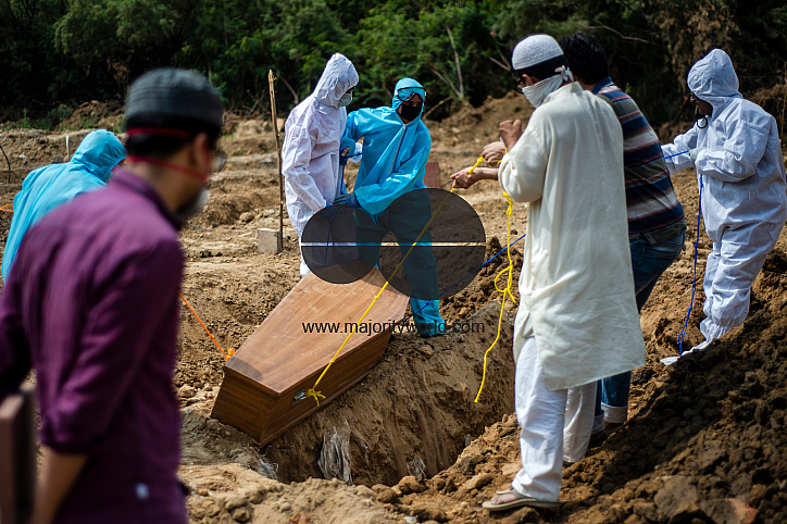 Relatives prepare to bury the coffin containing the body of a 23 years old man who died from the coronavirus disease (COVID-19), at a graveyard, as the country relaxed its lockdown restriction on May 13, 2020 in New Delhi, India. Photographer: Kuldeep Sin