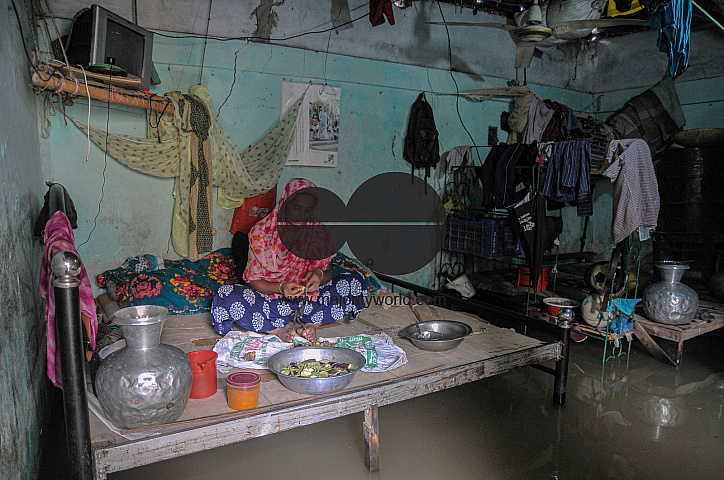 A women captive in flood water is preparing food sitting on the bed at a slum of kamalgo. Nearly 2.5 lakh people are marooned due to the rush of water from upstream and heavy rainfall triggered by the monsoon over the last week in Sylhet, Bangladesh.
