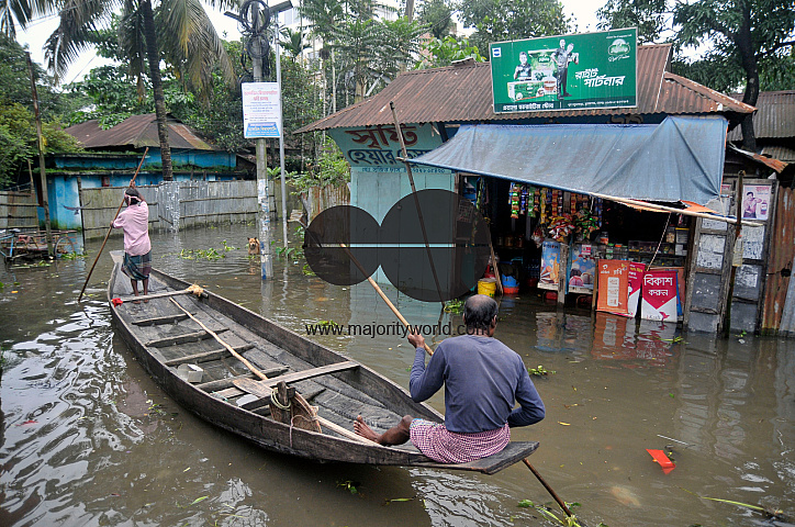 Due to heavy rains the river is overflowing. Boats are the only mode of transport for people even on roads in residential areas. The border district town of Sunamganj, Sylhet, Bangladesh.