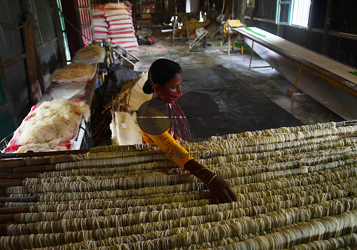 A worker arranging rice vermicelli called âSeviyanâ at a vermicelli factory, on the eve of Eid festival. There is a big demand for Vermicelli, during the Eid festival. Muslims use vermicelli to make traditional festive food. Agartala, Tripura, India.