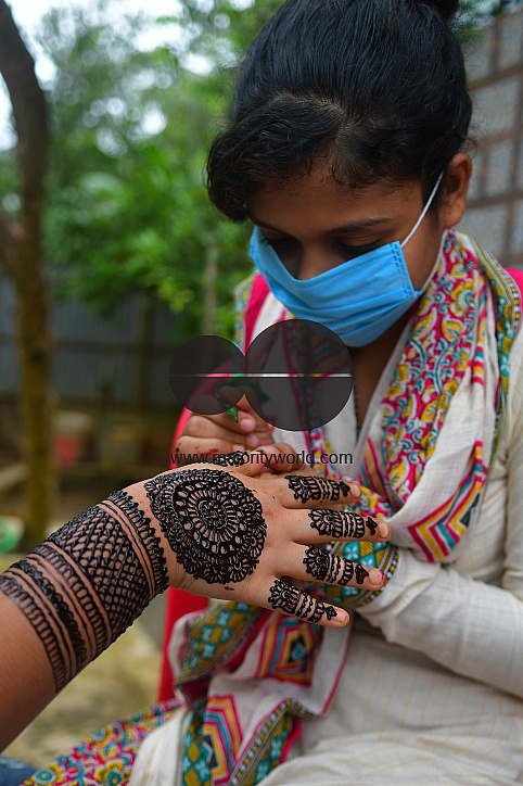 A Muslim girl painting traditional henna designs, ahead of the Muslim festival of Eid. During this period India is also badly affected by the Coronavirus. Agartala, Tripura, India.