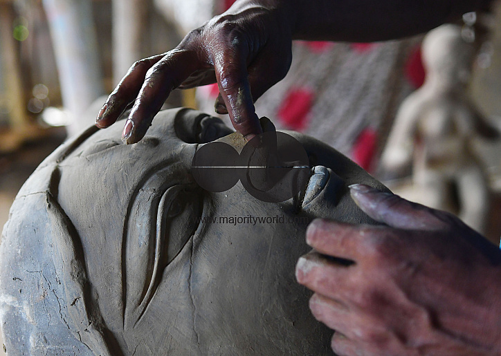 • Image Description: An Indian ceramic artists is sculpturing a clay face of Mother Goddess Durga at a studio, ahead of the Durga Puja festival. Durga Puja, the annual Hindu festival that involves the worship of the Durga goddess who symbolizes power and the triumph of good o