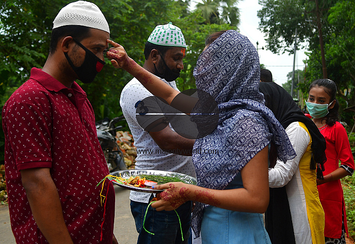 • Description: A Hindu girl ties a "Rakhi", a sacred thread, on the wrist of a Muslim man, at the Raksha bandhan festival, in the outskirts of Agartala. Tripura, India.