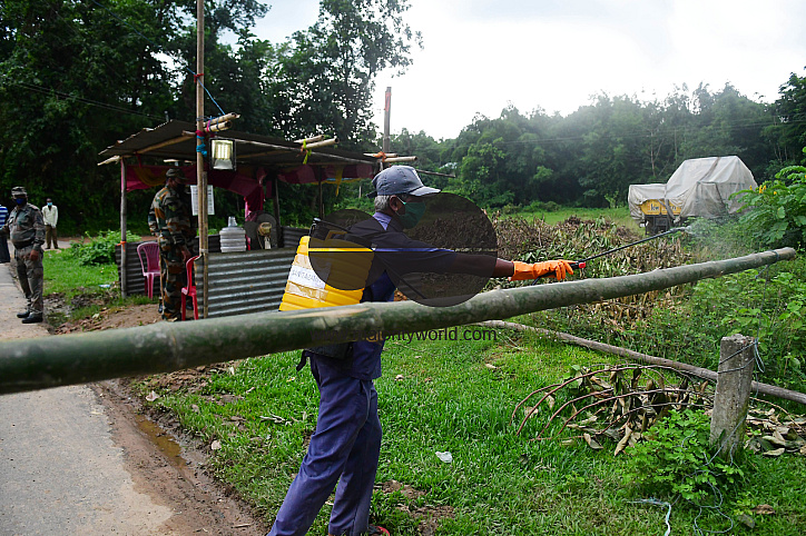 Workers wearing mask and protective gear are spraying disinfectant to sanitize the temporary gate of a containment zone, to prevent the spread of Coronavirus on the outskirts of Agartala. Tripura, India.
