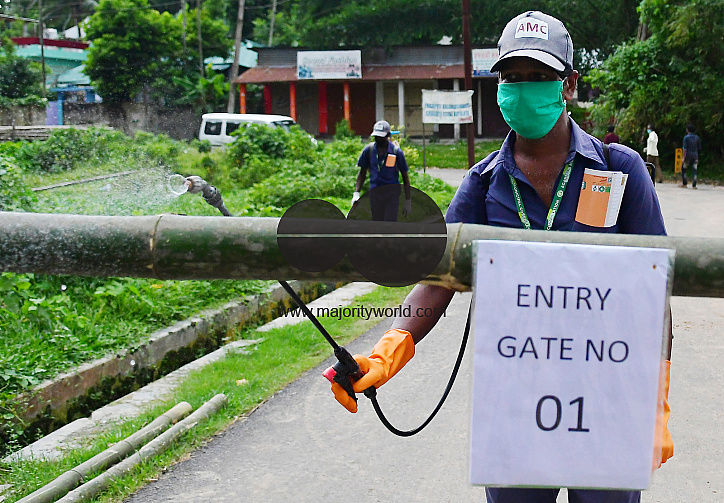 • Image Description: Workers wearing mask and protective gear are spraying disinfectant to sanitize the temporary gate of a containment zone, to prevent the spread of Coronavirus on the outskirts of Agartala. Tripura, India.