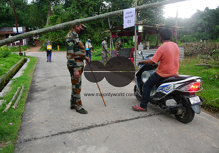 • Image Description: The TSR (Tripura State Rifles) personal are patrolling the area in front of a temporary gate at a containment zone, to prevent the spread of Coronavirus on the outskirts of Agartala. Tripura, India.