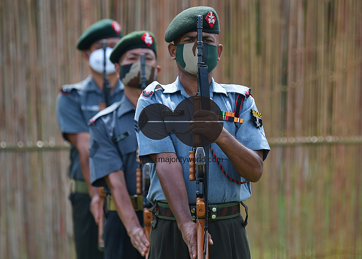 Police personnel wearing face masks take part in a rehearsal ahead of the 2020 Independence Day parade at the Assam Rifles ground in Agartala, Tripura, India.