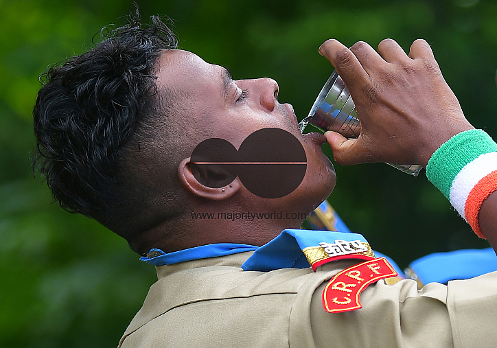 Police and other paramilitary personnel taking a water break during the Independence day celebrations at Assam Rifles ground, Agartala, Tripura, India.