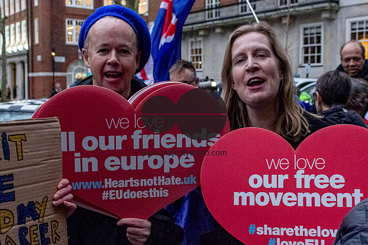 London,England.Two Remain supporters, standing outside Europe House , Westminster, with 'Hearts Not Hate' placards describing benefits of being in the EU on the eve of the United Kingdom's exit from the European Union at 11 pm on Friday 31st January 2020,