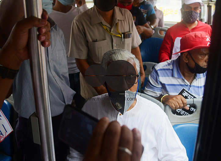 Opposition leader Manik Sarkar seated in the bus, after been arrested by police during a protest organised by CPI (M). Agartala, Tripura, India.
