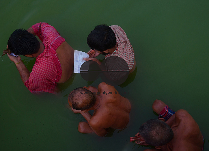 • Image Description: Indian Hindu devotees perform Tarpan, a ritual to pay obeisance to one's forefathers on the last day for offering prayers to ancestors called Pitri Tarpan. In Hindu mythology, this day is also called "Mahalaya" and described as the day when the Gods creat