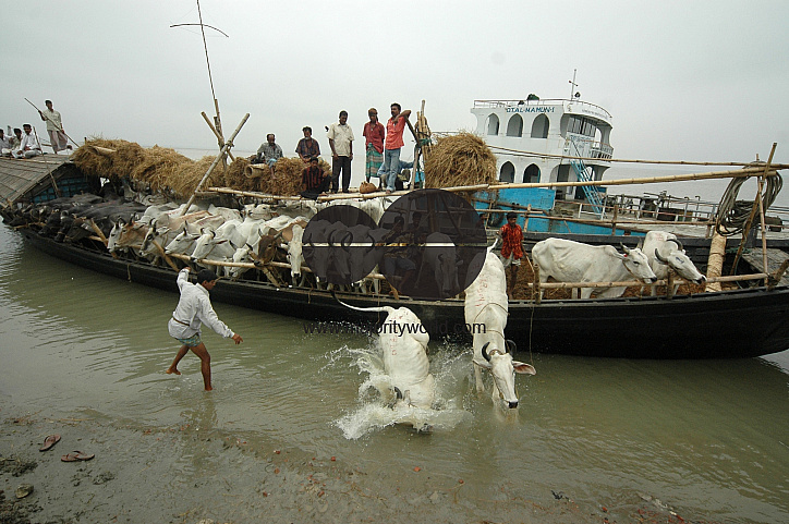 Cows brought from different parts of the country are sent to the cattle market at Gabtoli, Dhaka via Aricha ghat, Manikganj, Bangladesh. May 18, 2005.
