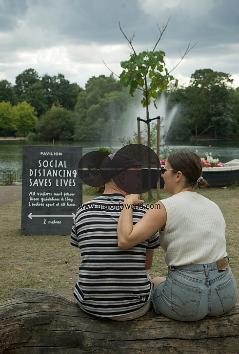 Young couple in a park with sign of government advice to keep safe social distance due to Coronavirus / Covid-19 pandemic in London, England, UK