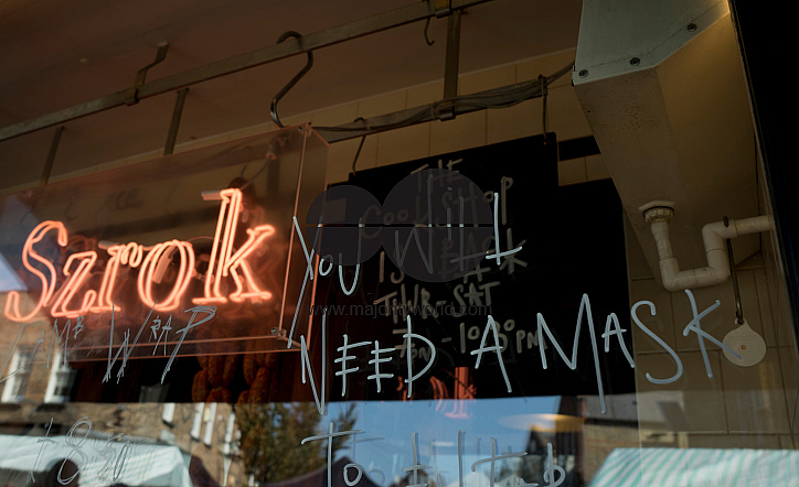 Visitors at Broadway Market, with street signs advising to keep safe social distance due to Coronavirus / Covid-19 pandemic in London, England, UK
