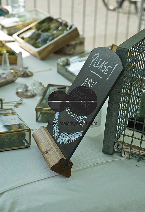 Visitors at Broadway Market, with street signs advising to keep safe social distance due to Coronavirus / Covid-19 pandemic in London, England, UK