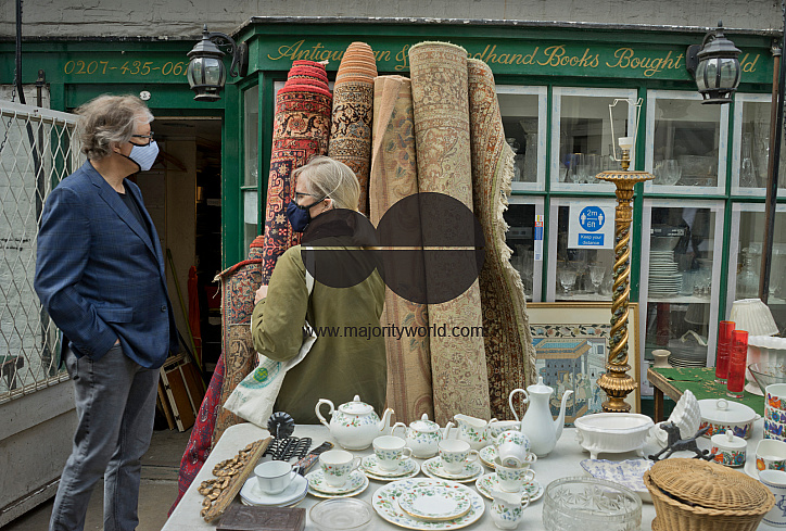 Visitors to the Hampstead antique market with signs advising to keep safe social distance due to Coronavirus / Covid-19 pandemic in London, England, UK