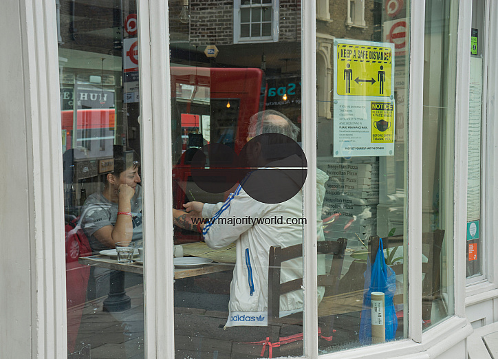Visitors to Hampstead cafe with signs advising to keep safe social distance due to Coronavirus / Covid-19 pandemic in London, England, UK