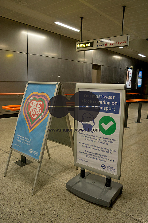 Passengers at a London underground train station, with signs advising to keep safe social distance due to Coronavirus / Covid-19 pandemic in London, England, UK