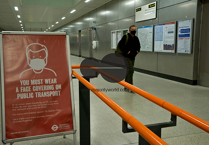 Passengers at a London underground train station, with signs advising to keep safe social distance due to Coronavirus / Covid-19 pandemic in London, England, UK