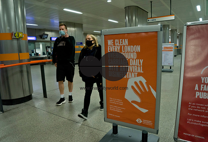 Passengers at a London underground train station, with signs advising to keep safe social distance due to Coronavirus / Covid-19 pandemic in London, England, UK