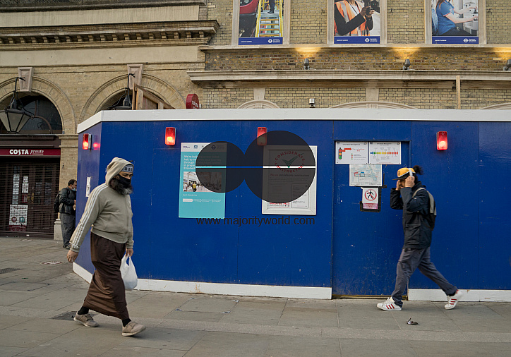 Local residents walking by Whitechapel market, with signs advising to keep safe social distance due to Coronavirus / Covid-19 pandemic in London, England, UK