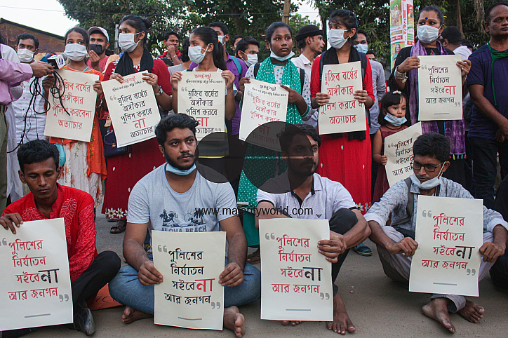 Conscientious people of Sylhet holding placards protesting the murder of a young man in police custody and demanding strict punishment for the accused policemen. Meanwhile four police officers have been suspended and three others withdrawn from duty in Sy