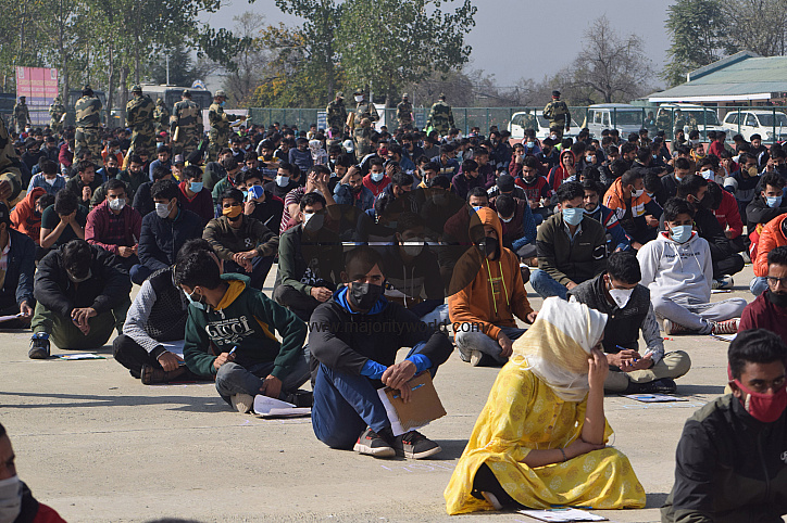 • Image Description: Candidates who had initially applied and gone through the physical tests appeared for a written test during the BSF recruitment drive in Srinagar.