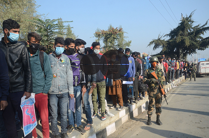 • Image Description: Candidates who had initially applied and gone through the physical tests appeared for a written test during the BSF recruitment drive in Srinagar.