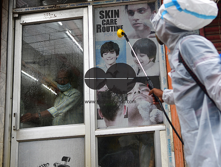 Workers sanitizing shops which are closed at the market area Tripura. This is before people started rushing to shops to buy clothes ahead of the Durga Puja festival. Agartala. Tripura, India.