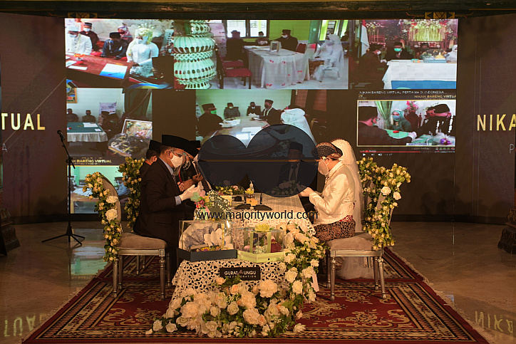• Description: Two brides wearing traditional Javanese clothes and masks are getting married during a wedding ceremony at the Ambarukmo Hotel Yogyakarta. At the same time, 9 other brides are also having weddings in several different regions. The ceremonies are displayed on the screen and witnessed by invited guests virtually from the Yogyakarta Ambarukmo Hotel. The bride and groom must implement the health protocol, washing hands, wearing masks and keeping a distance. Indonesia.