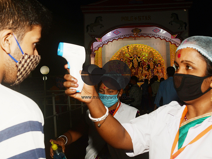 • Description: The health workers are checking temperature through infrared in front of a Puja Pandal, at Agartala. The festival is the biggest religious event for Bengali Hindus. Hindus believe that the goddess Durga symbolizes power and the triumph of good over evil. Agartala, Tripura, India.
