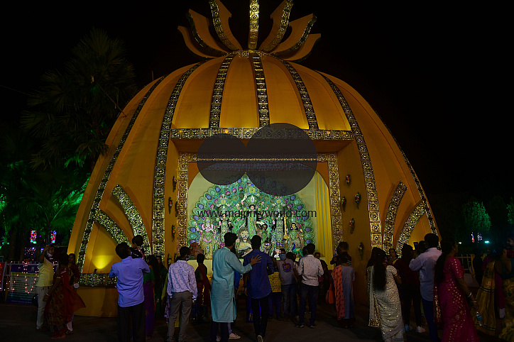 • Image Description: People in front of a Puja Pandal, at Agartala. The festival is the biggest religious event for Bengali Hindus. Hindus believe that the goddess Durga symbolizes power and the triumph of good over evil. Agartala, Tripura, India.
