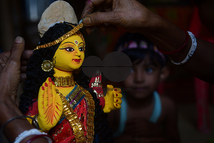 • Image Description: Craftsman preparing the idol of Goddess Lakshmi on the eve of the Lakshmi Puja at Agartala. Hindu devotees, especially women at home fast in worship of the goddess in order to seek blessings for wealth and prosperity in the family. Agartala, Tripura, Indi