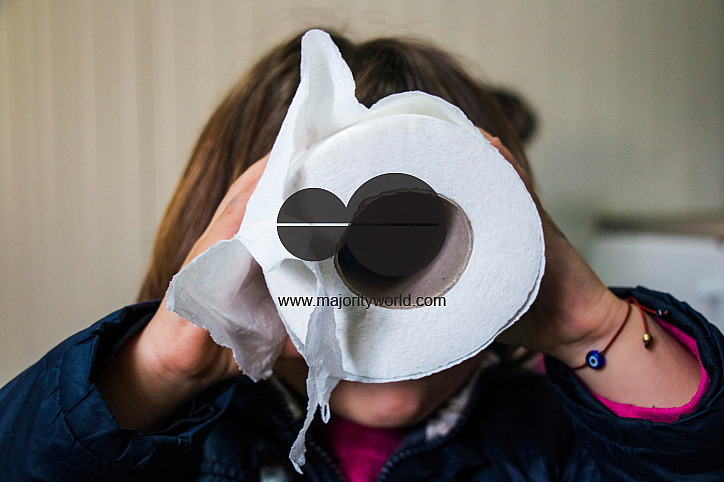 A child looks through a toilet paper role without knowing what the future holds. Skaramagas hosts a âtemporaryâ refugee camp, a kind of waiting room where migrants coming mainly from Syria, Iraq and Afghanistan are staying before being resettled elsewhere in Europe. In Skaramagas, they can also learn whether their request for relocation has been approved or rejected. Makariou, Skaramagkas, Greece.