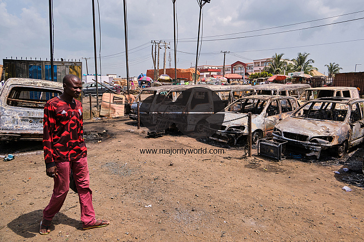 A man looks at damaged vehicles at a site following an explosion after a tanker carrying fuel crashed at Kara Bridge along the Lagos-Ibadan highway. Eye-witnesses claim 3 people were burnt to death, vehicles parked at a bus station and some for sale at a lot were burnt in the accident which happened around 2am after a fuel-laden tanker exploded after losing its tires. Lagos, Nigeria. November 7, 2020.