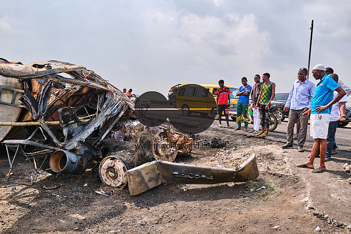 People passing by look at damaged vehicles at a site following an explosion after a tanker carrying fuel crashed at Kara Bridge along the Lagos-Ibadan highway. Eye-witnesses claim 3 people were burnt to death, vehicles parked at a bus station and some for