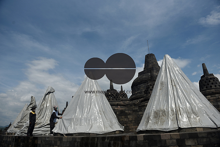 • Image Description: Borobudur Temple Conservation officers are wrapping several stupas using tarpaulin. The wrapping was carried out on the 8th floor and the 1st hall of the temple located in Magelang Central Java, Indonesia. Increasing the status of Mount Merapi to alert or