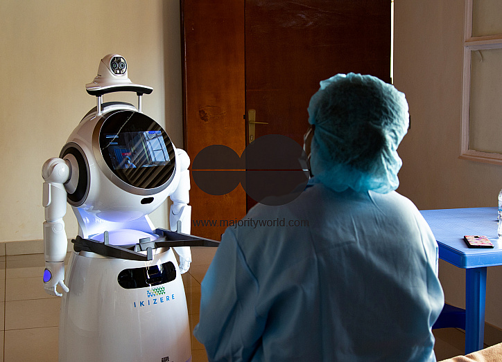 Robot technician at Kanyinya Health center. Robots are used to minimize coronavirus risks. They carry out basic tasks like checking temperatures, monitoring patients to reduce human exposure to the virus. Kanyinya Healh Center, Kigali, Rwanda.