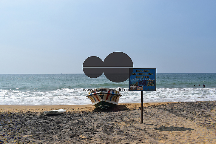 Boat stationed on shore at the Beach offering boat rides and fishing tours. Mount Lavinia Beach is the main sea-bathing spot in Colombo. The scenic beach offers a stretch of sand, waves, lifeguards, hotels & nearby restaurants. Colombo, Sri Lanka.
